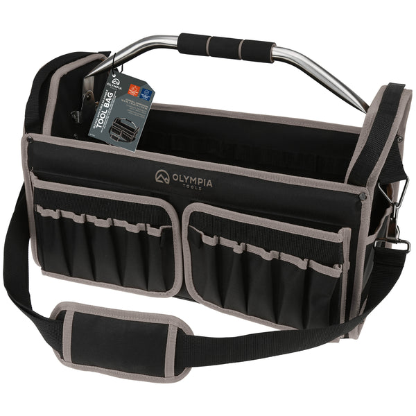 OPEN TOP, STEEL HANDLE, AND SHOULDER STRAP  Tool Bag: Specifically designed for professional workloads, maintenance tools, electricians tools, and heavy-duty hardware. Stainless steel handle provides a sturdy grip to transport heavier tools Dimensions: Features 40 external pockets, 4 internal pockets,...View more